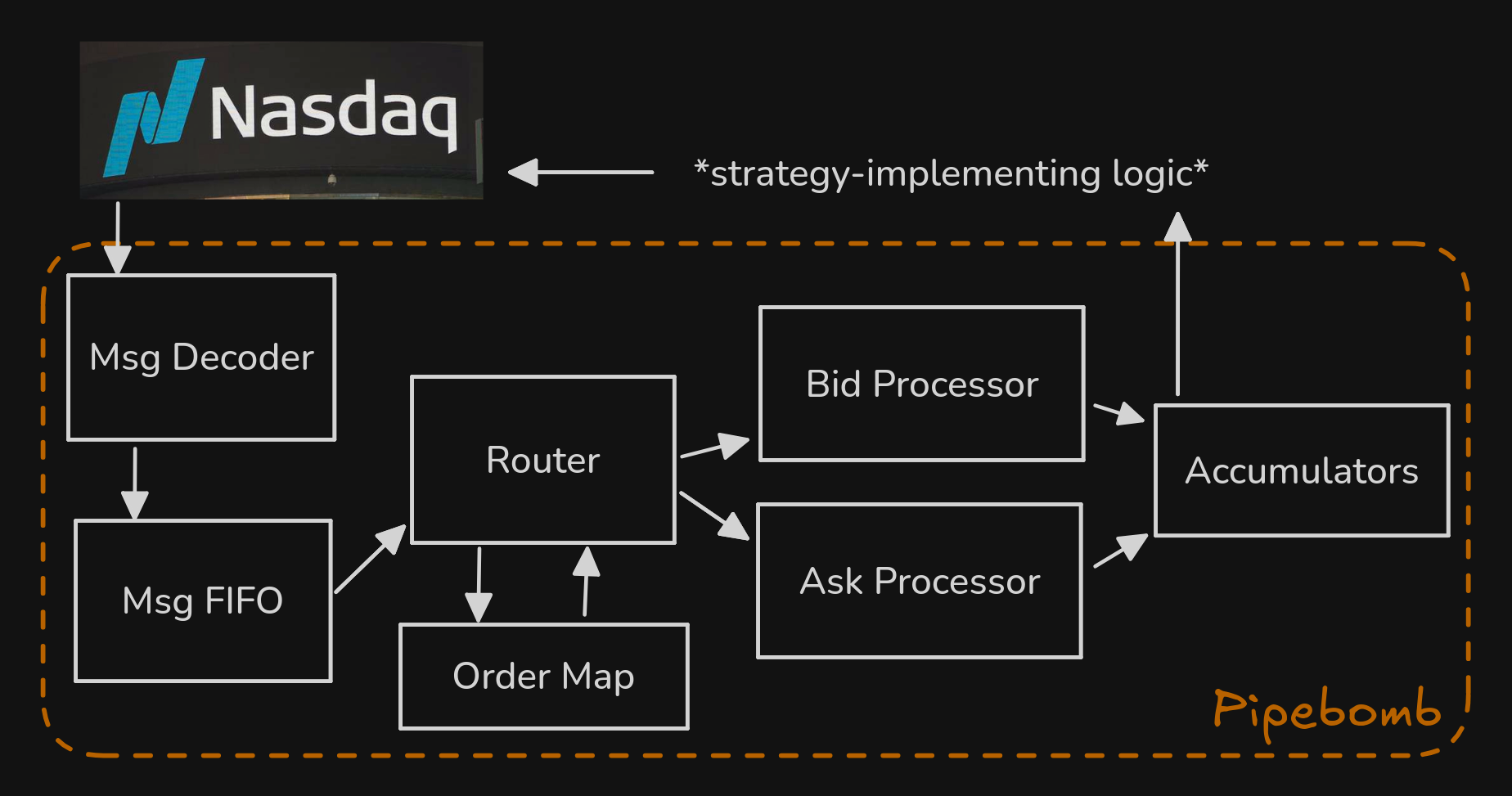 This page explains the design of a pipelined order book called Pipebomb. Pipebomb Is a Pipelined and Eventually Balanced Order-Managing Book. In short, the hardware module takes in a stream from Nasdaq’s ITCH protocol and maintains calculations of metrics that drive strategic decisions. These metrics are accumulated in discrete and configurable circuits that read from caches for internal order book data structures (see Caching). The following sections break down Pipebomb into it’s data structures, algorithms, and pipeline stages. Find more information in the Discord or the source.